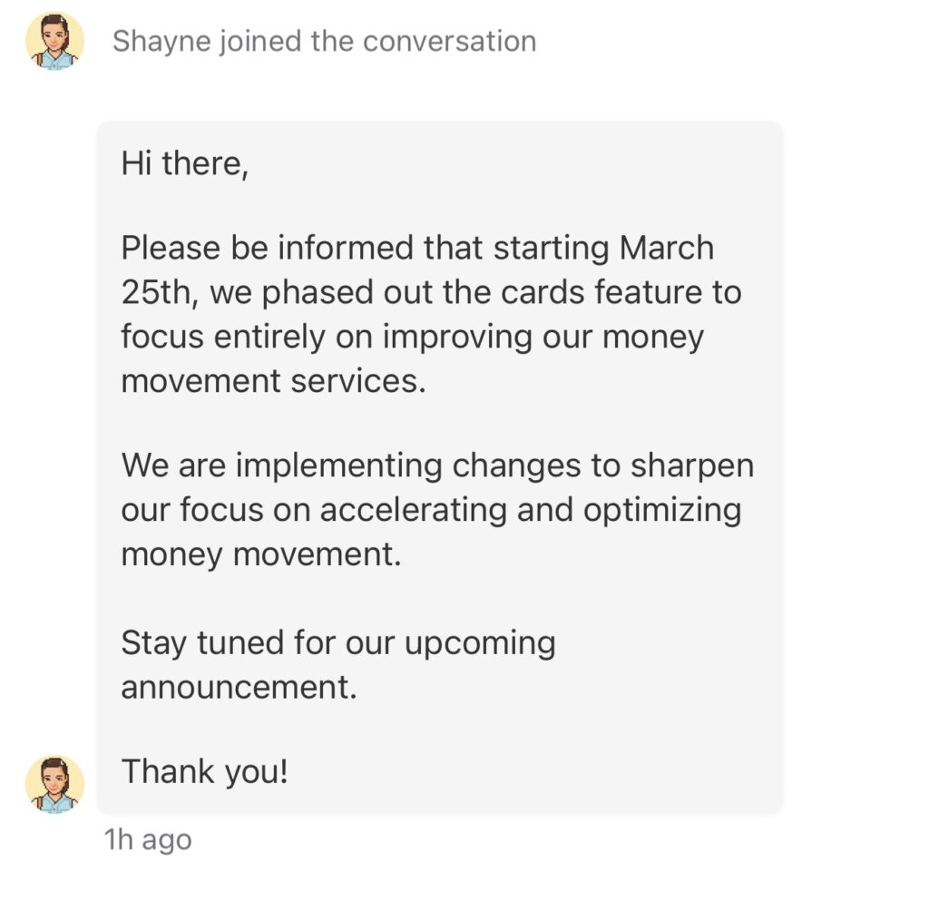 According to their support staff, the card feature was phased out on March 25th as the company shifts its focus entirely to money movement services.