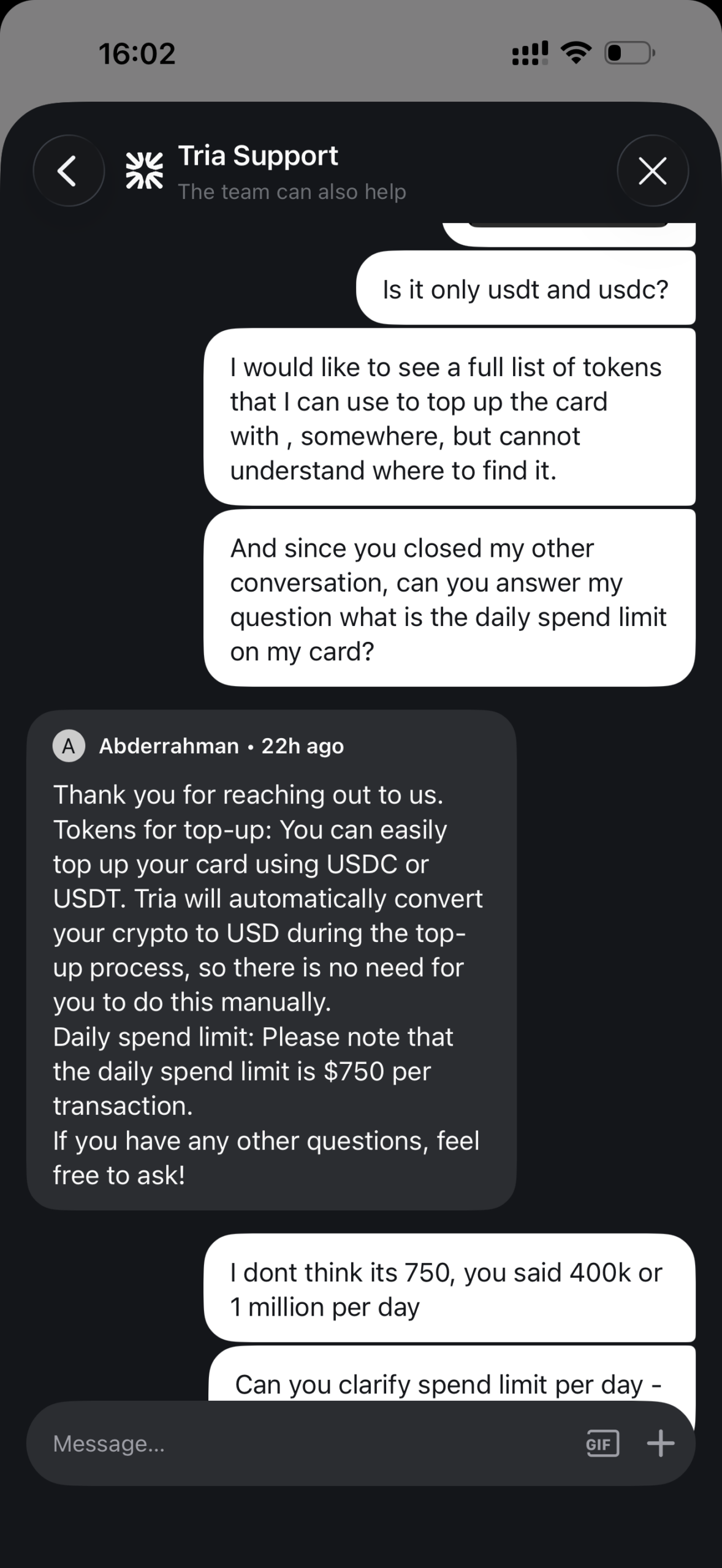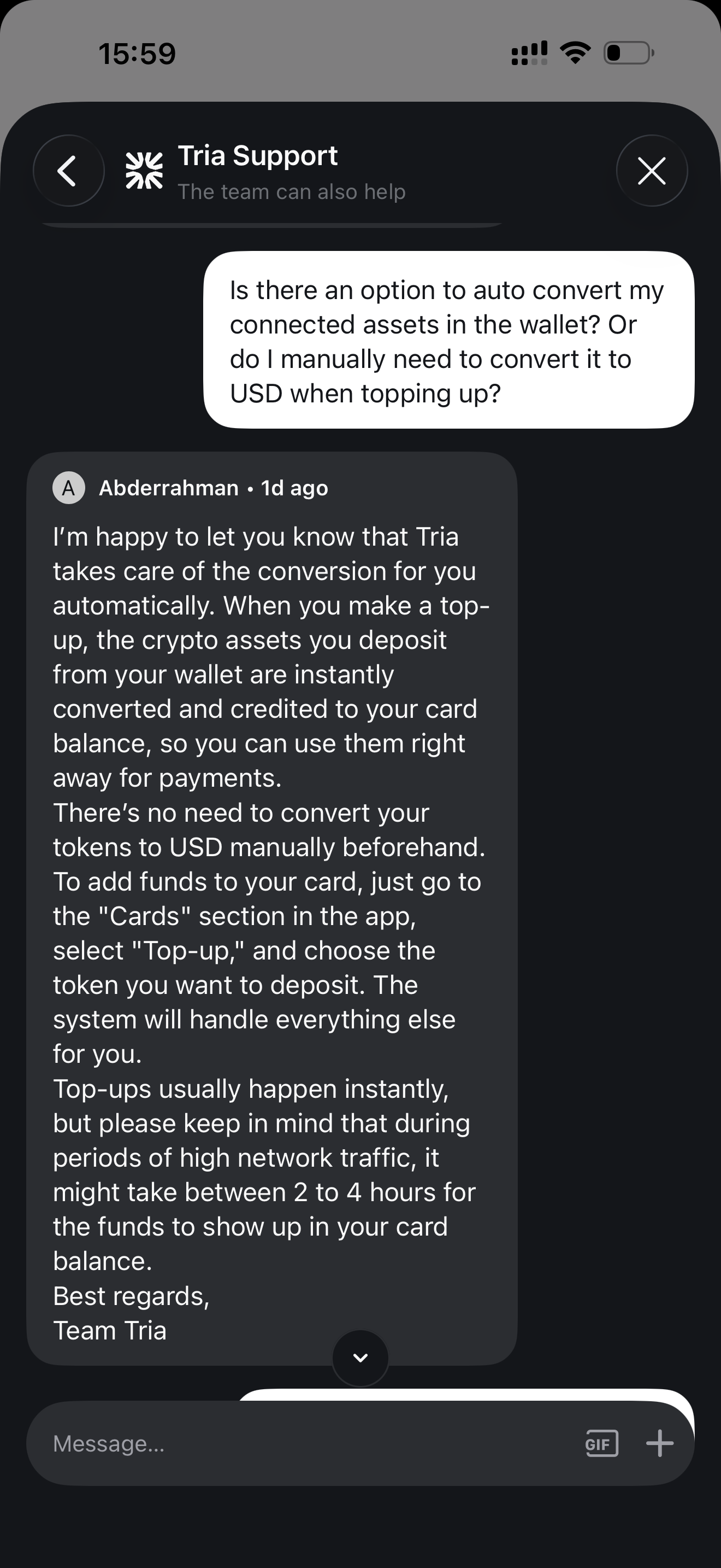 Before you can use your Tria Card, you will need to top-up your account. This means you will have to convert your crypto in advance, exchanging it to USD and moving it to the card account, to make it available for spending.