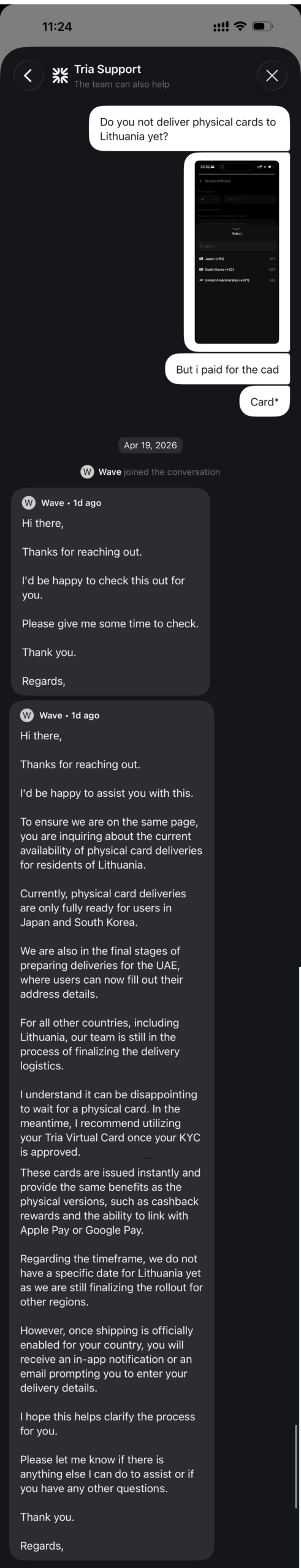 Tria Card supports the following countries: Afghanistan, Åland Islands, Albania, Algeria, American Samoa, Andorra, Angola, Anguilla, Antigua and Barbuda, Argentina, Armenia, Aruba, Australia, Austria, Azerbaijan, Bahamas, Bahrain, Bangladesh, Barbados, Belgium, Belize, Benin, Bermuda, Bhutan, Bolivia, Bonaire, Sint Eustatius, and Saba, Bosnia and Herzegovina, Botswana, Bouvet Island, Brazil, British Indian Ocean Territory, Brunei, Bulgaria, Burkina Faso, Burundi, Cambodia, Cameroon, Canada, Cayman Islands, Central African Republic, Chad, Chile, Christmas Island, Cocos (Keeling) Islands, Colombia, Comoros, Cook Islands, Costa Rica, Croatia, Curaçao, Cyprus, Czechia, Denmark, Djibouti, Dominica, Dominican Republic, Ecuador, El Salvador, Equatorial Guinea, Eritrea, Estonia, Ethiopia, Falkland Islands, Faroe Islands, Federated States of Micronesia, Fiji, Finland, France, French Guiana, French Polynesia, French Southern Territories, Gabon, Gambia, Georgia, Germany, Ghana, Gibraltar, Greece, Greenland, Grenada, Guadeloupe, Guam, Guatemala, Guernsey, Guinea, Guinea-Bissau, Guyana, Haiti, Heard and McDonald Islands, Honduras, Hong Kong, Hungary, Iceland, Indonesia, Ireland, Isle of Man, Italy, Jamaica, Japan, Jersey, Jordan, Kazakhstan, Kenya, Kiribati, Kosovo, Kuwait, Kyrgyzstan, Laos, Latvia, Lebanon, Lesotho, Liberia, Libya, Liechtenstein, Lithuania, Luxembourg, Macao, Madagascar, Malawi, Malaysia, Maldives, Mali, Malta, Marshall Islands, Martinique, Mauritania, Mauritius, Mayotte, Mexico, Moldova, Monaco, Mongolia, Montenegro, Montserrat, Morocco, Mozambique, Namibia, Nauru, New Caledonia, New Zealand, Niger, Nigeria, Niue, Norfolk Island, North Macedonia, Northern Mariana Islands, Norway, Oman, Pakistan, Palau, Palestine, Panama, Papua New Guinea, Paraguay, Peru, Philippines, Pitcairn Islands, Poland, Portugal, Puerto Rico, Qatar, Réunion, Romania, Rwanda, Saint Barthélemy, Saint Helena, Saint Lucia, Saint Martin, Saint Pierre and Miquelon, Samoa, San Marino, São Tomé and Príncipe, Saudi Arabia, Senegal, Serbia, Seychelles, Sierra Leone, Singapore, Sint Maarten, Slovakia, Slovenia, Solomon Islands, Somalia, South Africa, South Georgia and the South Sandwich Islands, South Korea, South Sudan, Spain, St Kitts and Nevis, St Vincent and Grenadines, Sudan, Suriname, Svalbard and Jan Mayen, Sweden, Switzerland, Taiwan, Tajikistan, Tanzania, Thailand, The Netherlands, Togo, Tokelau, Tonga, Trinidad and Tobago, Tunisia, Turkmenistan, Turks and Caicos Islands, Tuvalu, U.S. Outlying Islands, U.S. Virgin Islands, Uganda, United Arab Emirates, United Kingdom, United States, Uruguay, Uzbekistan, Vanuatu, Vatican City, Wallis and Futuna, Western Sahara, Yemen, Zambia, Zimbabwe.